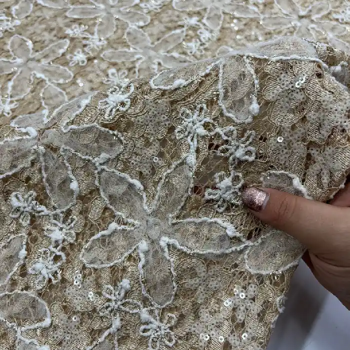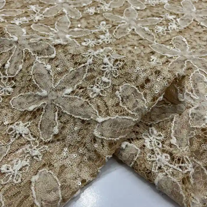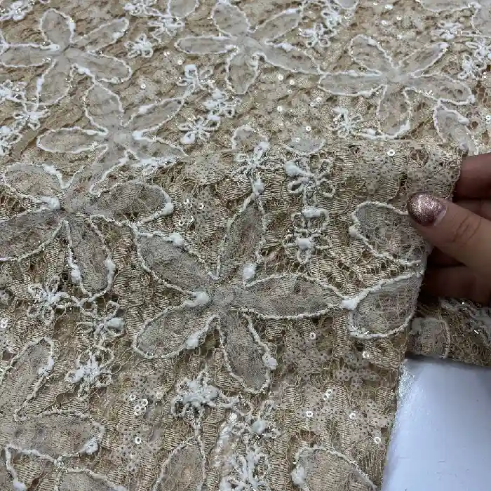 پارچه دانتل گل تور پولکدوزی رنگ نسکافه ای