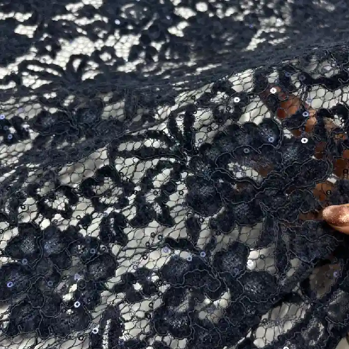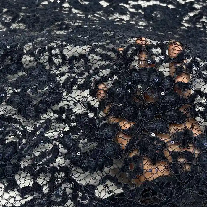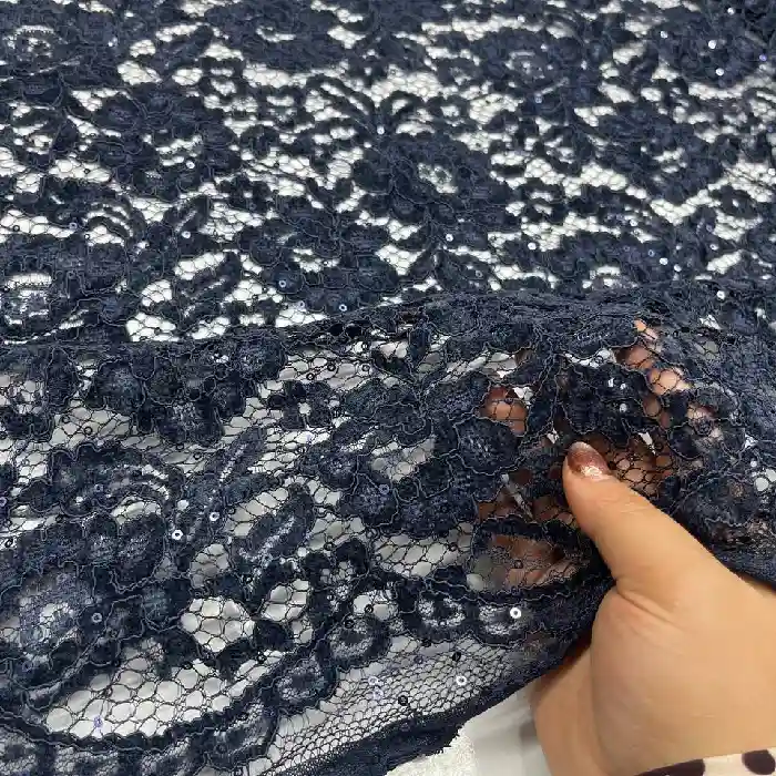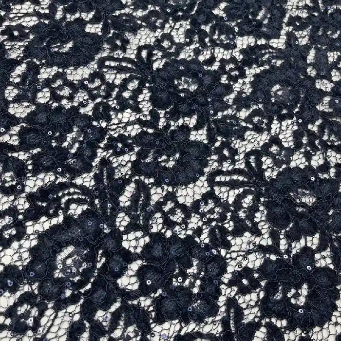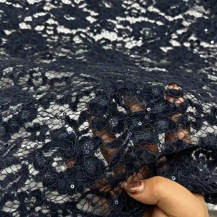 پارچه دانتل گل مخمل پولکی رنگ سورمه ای