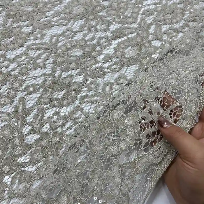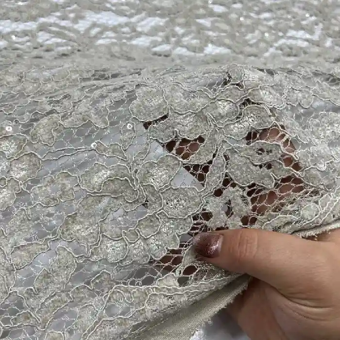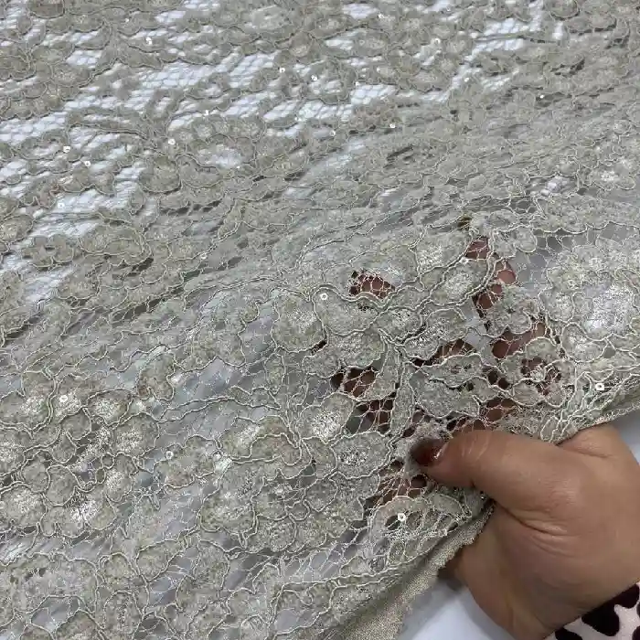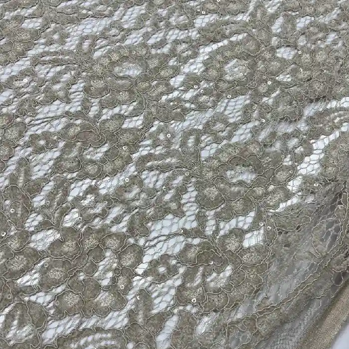 پارچه دانتل گل مخمل پولکی رنگ فیلی خاکی